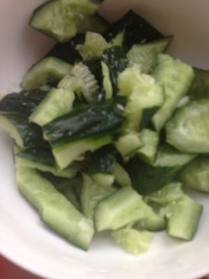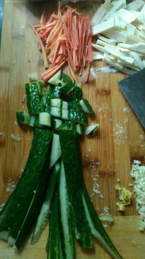放黄瓜,蒜姜,胡萝卜丝,麻油,辣子油,醋,酱油,鸡精(鸡精可放可不放)
