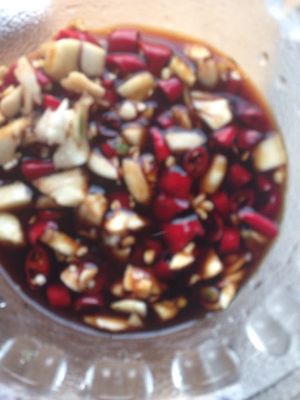 小米椒,大蒜切碎,加入酱油陈醋糖,辣油调汁
