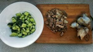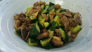 将脱骨的棒骨肉倒入拍好的黄瓜当中 放入少许骨头汤 生抽 醋 糖 香油调味 搅拌均匀