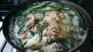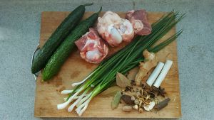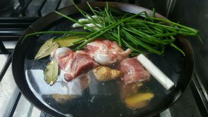 凉水下锅 将棒骨和大料 香葱 姜 料酒等一起下锅