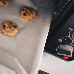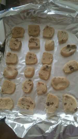 烤好后是这样的,曲奇不拘泥于形状,如果你喜欢颜值高的可以用裱花嘴做形状,但是最好就用巧克力碎不用巧克力豆,因为怕堵花嘴。