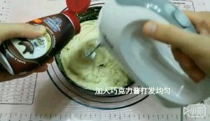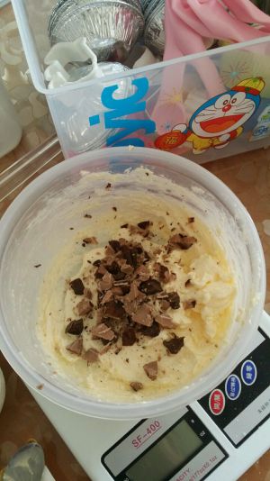 加入牛奶继续用打蛋器打匀,放入切成小颗粒的巧克力或者碎末