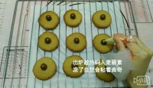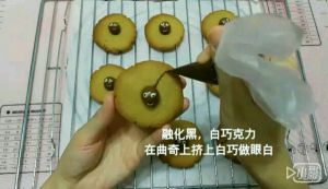 出炉趁热放入麦丽素,凉了自然会粘在曲奇上,融化黑白巧,挤上眼晴
