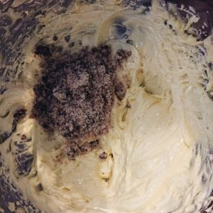 室温软化黄油,加入糖粉,以及砂糖,用打蛋器高速打发