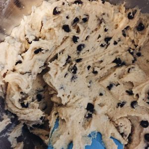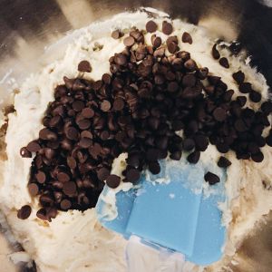 最后加入耐热巧克力豆(如果没有巧克力豆的话可以拿巧克力块切碎代替),混合搅拌均匀。