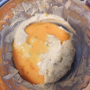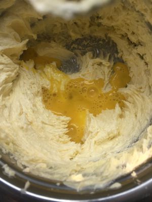 一个鸡蛋,敲入碗中,手动打散,待黄油打发成淡色发白的羽毛状,分3次加入蛋液,每加一次,搅打蛋液完全融入到黄油中