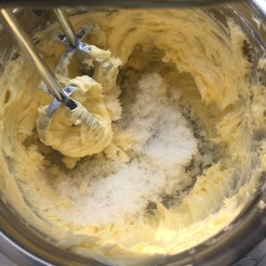 把提前软化好的黄油放入打蛋盆中,加入糖粉和海盐拌匀后用电动打蛋器蛋发至黄油蓬松颜色变白。