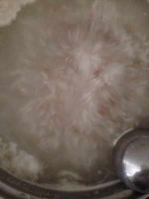 大米煮成底粥,大米提前泡好,开水煮制,滴几滴食用油,提香提色