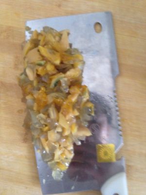 锅里入油,待油稍热的时候放入蛏干快速翻一下出香味后,加入洋葱、青菜、虾仁廋肉等翻炒。