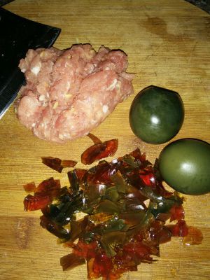 因为我熬了三个人的份,所以用了三两肉,两个皮蛋,姜末一次剁碎在肉里了。