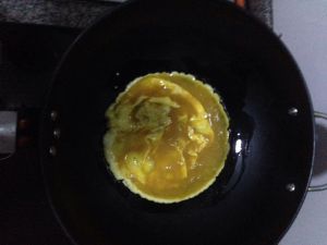 倒一点蛋下去均衡,煎到金黄色就可以,蛋皮在煎的时候要薄点才好吃。