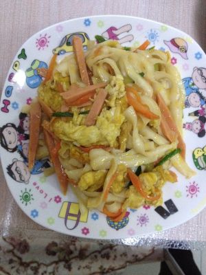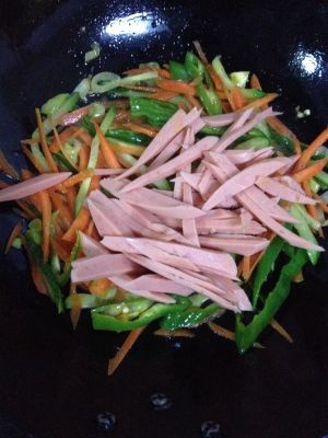 放人火腿肠,炒半分钟,放人面条,炒熟,加入提前炒好的鸡蛋!