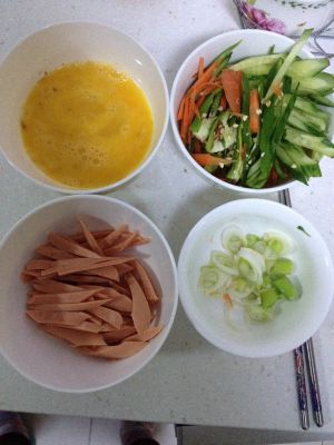 葱花准备好,然后所有菜切丝,鸡蛋加花椒,少量盐打散