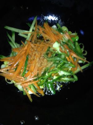 油热,放葱花,尖椒胡萝卜丝黄瓜丝,炒软放十三香,盐,鸡精,少量蚝油,和海鲜酱油,