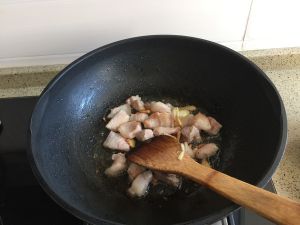 腌制好的猪肉下锅炒至肉色发白,盛出。