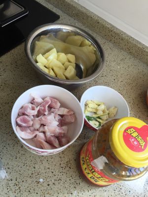 猪肉切块,用盐和料酒稍微腌制5分钟。