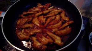 锅内倒入少许油、用姜片把油涂匀锅底,鸡翅放在姜片上,煎至两面浅金黄色。
