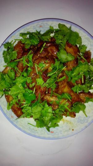 然后起锅,装进盘里,把香菜洗干净,切好,撒在可乐鸡翅上就可以了(或可以把香菜切好铺在盘底,然后再放可乐鸡翅也可以)这样就OK啦。