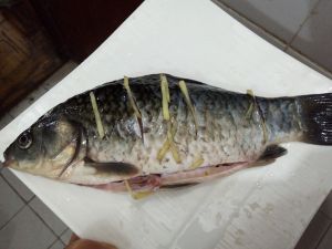 全家福一张,鲫鱼去鳞片收拾干净,用盐涂至全身和腹部