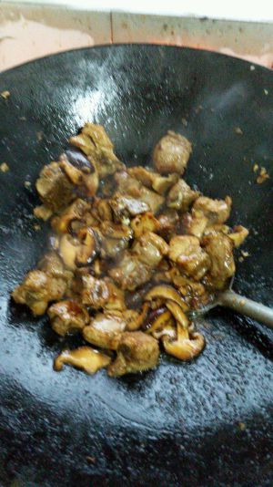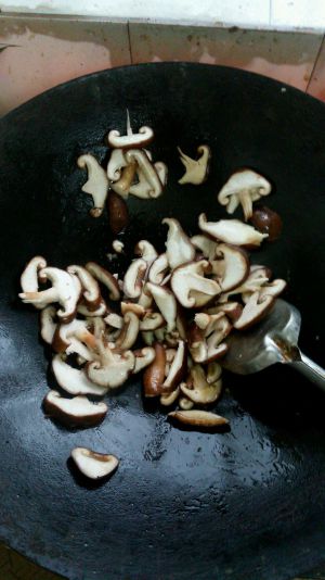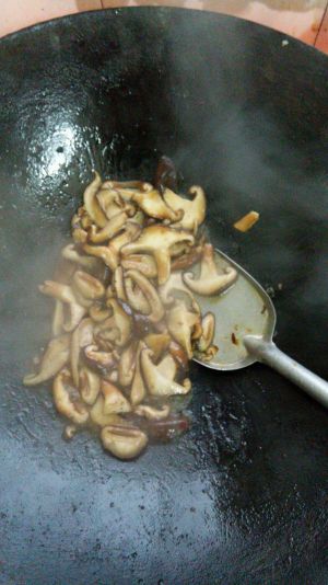 放一点水,一勺酱油一起翻炒均匀,盖盖子至香菇完全熟透就炒出备用。