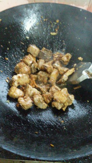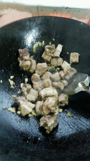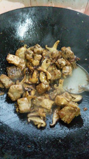 热锅里倒入适量的油,放入腌制好的排骨煎至两面金黄,加入适量的老抽上色,加入几粒小冰糖,再放入香菇炒一下,加一点清水,最后加入适量的蚝油,如果不够咸,可以适量的加点盐。