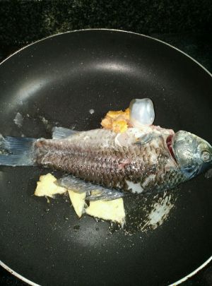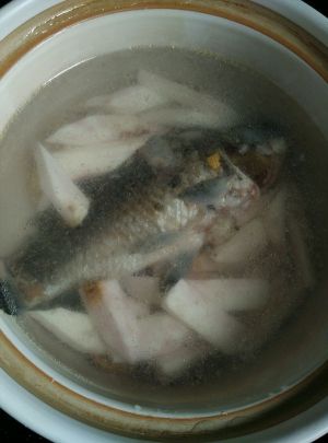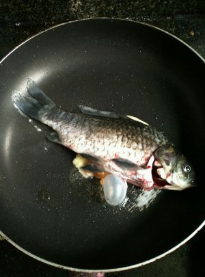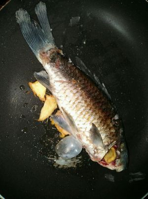 鱼煎好后捞出蒜,加水三碗,姜片,炖20分钟。