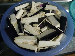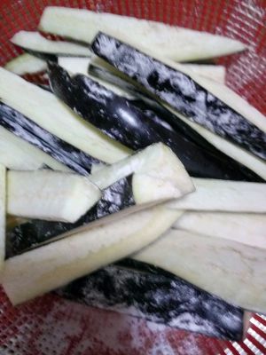 茄子处理B:炸茄条。油烧至八成热,茄条炸熟炸透,大约需要炸4分钟。