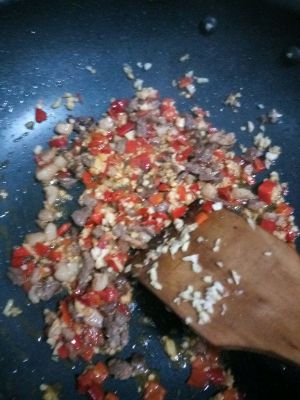 肉末处理C:放入剁椒继续煸炒至出红油。