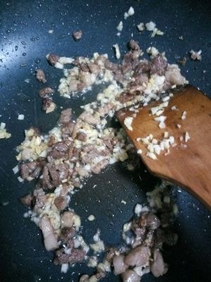 肉末处理B:放入姜蒜粒儿继续煸炒。