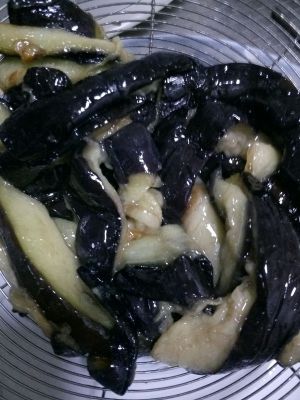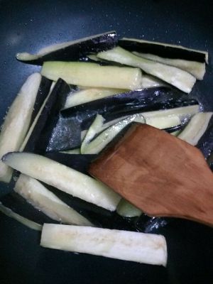 锅中放适量油,倒入茄子煎至变色捞出备用。(最好选无烟锅)