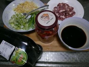 食材准备:葱姜蒜切粒儿,调好酱汁,猪肉牛肉切粒儿,茄子切条。