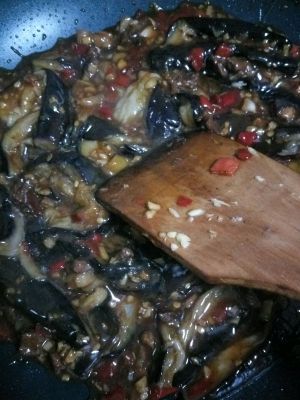 加油起锅,把蒜末和姜末放入锅中,煸出香味,加入豆瓣酱,把糖和粗放到一起融化,倒入锅中,待烧开,放入茄子,翻炒,均衡上色,从锅中把茄子放入沙锅中,加水。