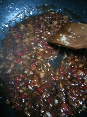 锅热油,放入姜蒜爆香后放碎肉翻炒,再加入豆瓣酱翻炒。