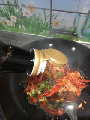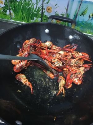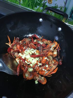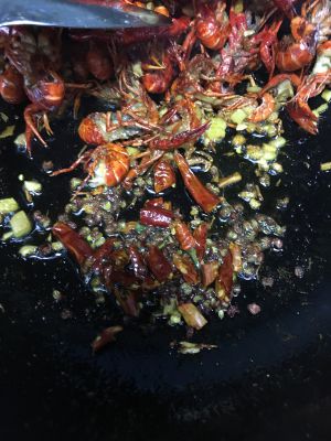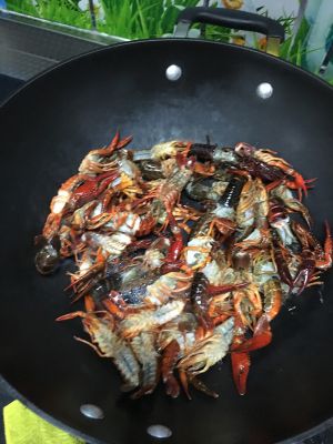 热油下锅,将准备的原材料郫县豆瓣酱、火锅底料、干辣椒下入锅内翻炒,放冰糖葱姜,料酒和十三香!翻炒均匀,下入小龙虾!翻炒几下,下入水!放些盐,自己掌握一下,口味!煮20分钟即可!最后几分钟大火收汁即可.