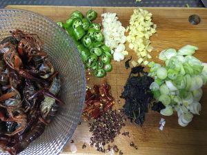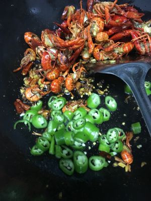 龙虾扒一边,放入干辣椒和花椒爆香,再一起翻炒。