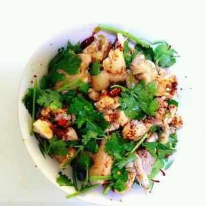 干煸花椒,炒出花椒油,花椒抄黑后剩下的油倒入先前调制的料汁中,花椒倒掉。 上边忘记说了这个调料