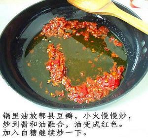 锅里放15克油,放入冰糖,小火炒糖色,要不定不停地搅拌,直到冰糖融化变成金黄色的糖浆