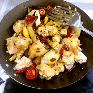 锅里热油,放入蒜米,姜丝,干辣椒,炒出香味。