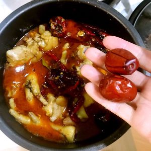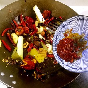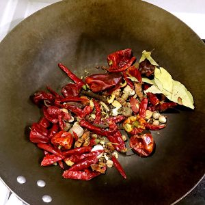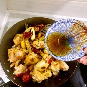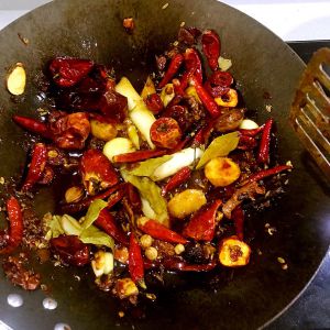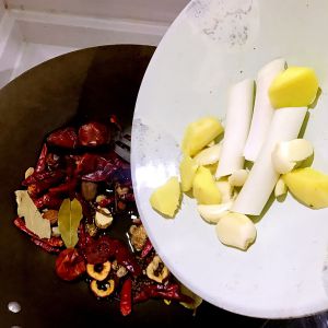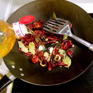 放入生姜片,蒜瓣,干尖辣椒,桂皮,八角,香叶炒香