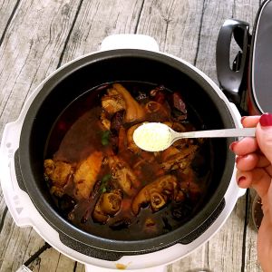 炖到锅里汤汁只剩下一半,打开锅盖放盐,翻炒均匀继续盖上锅盖