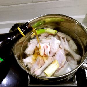 猪蹄鸡爪翅中冷水入锅,加葱段,料酒焯水