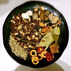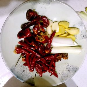 蒜姜用刀拍下,葱切段,干红辣椒和干灯笼椒洗净备用