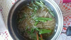 将红薯粉、小油菜放入酸辣汁中,加两大勺鸡汤,再放上花生米、黄豆、香菜