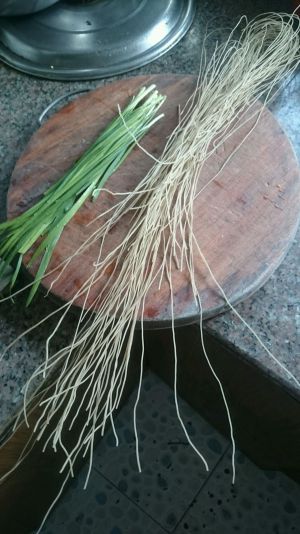 煮好后关火,然后放韭菜,把韭菜烫熟,不要煮,不然不脆,然后放秘密武器,不加辣的油泼辣子,放点花椒,葱姜蒜,少量醋,花椒油,就行了!
