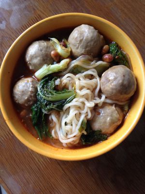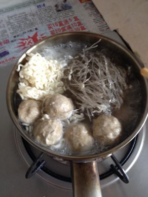 水开后放牛肉丸先煮,丸子浮起来后方面和粉丝继续煮