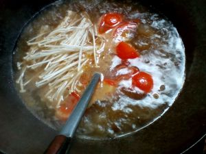 先加番茄,把汤烧漂亮了!然后加金针菇啦