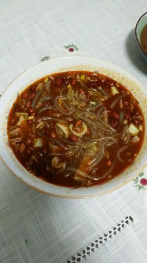 炒锅加热放油,先把蒜、辣椒、加工的花椒煸炒出香味,放入水,待水开后放入粉丝、白菜,加入少量味达美、适量醋、盐,大火煮3-5分钟,关火出锅,盛盘放入花生。味道相当不错