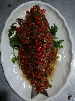 将煸炒好的料均匀铺至鱼上,上锅蒸至15-20分钟,撒上葱花即可