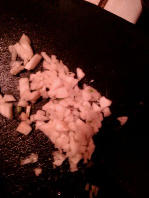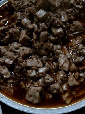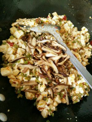 火中加油,油热后加混合的酱料,蒜末,蘑菇丁。煸炒一会。放入豆腐块,然后用锅铲边炒边按碎豆腐,加入少量的盐,鸡精。豆腐入味出锅
