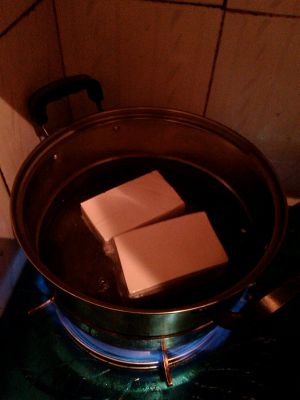 豆腐入水煮三分钟,去除碱水的味道